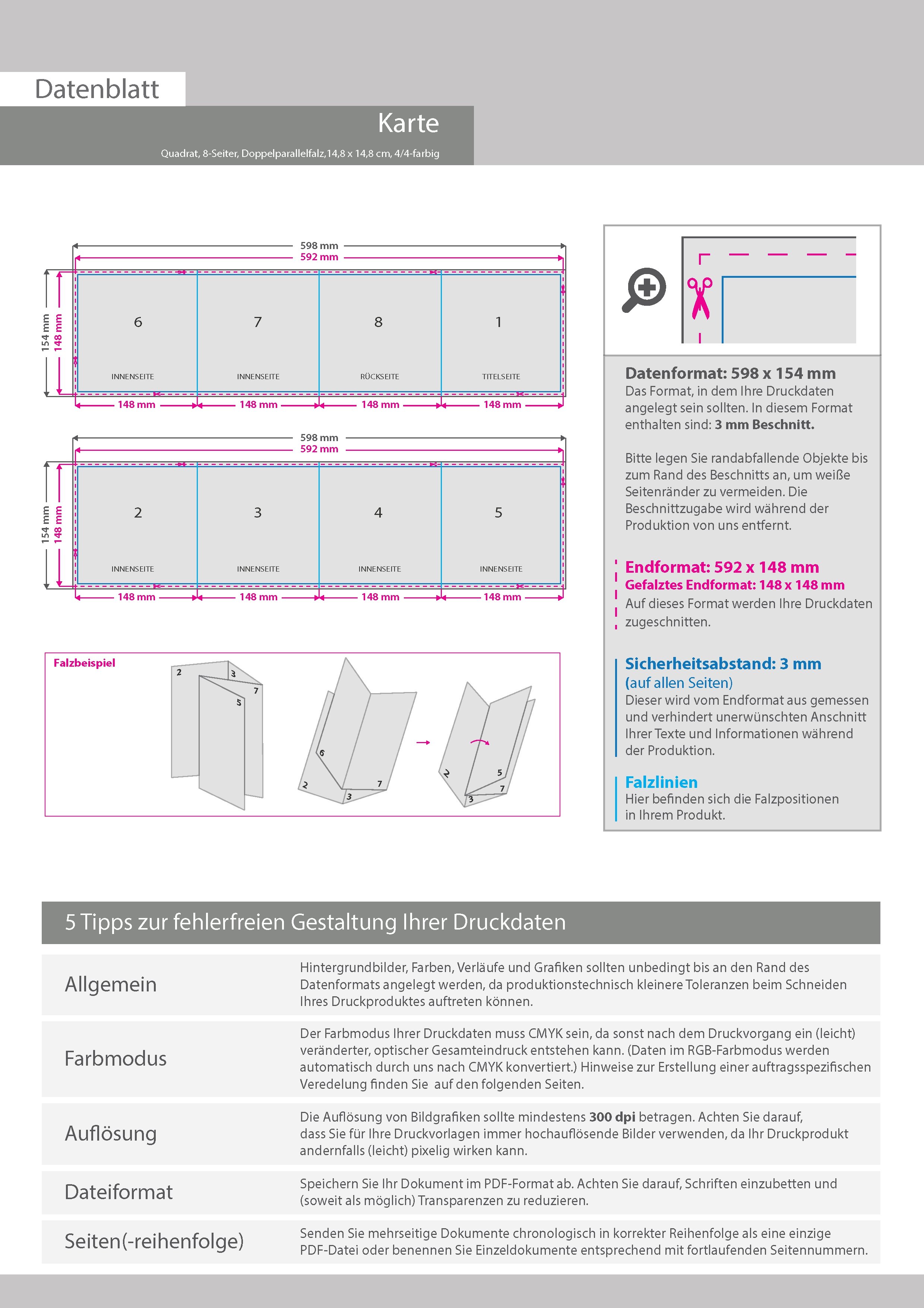 Geburtstagskarte, gefalzt auf Quadrat 14,8 cm x 14,8 cm, vertikaler Doppelparallelfalz, 8-seitig